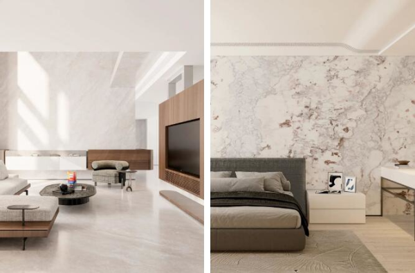 ▲冠珠華珍巖板大宅設(shè)計案例鑒賞——【客廳地面:廣漠黃、臥室背景墻:琉璃紫】