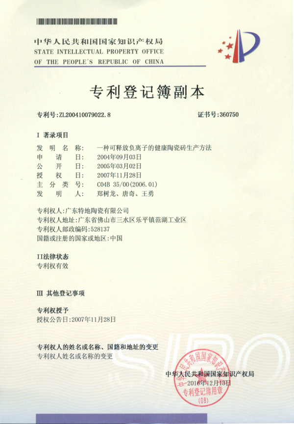 負(fù)離子瓷磚于2007年榮獲國(guó)家發(fā)明專利證書,專利號(hào)【ZL200410079022.8】,圍繞本專利的發(fā)明專利已公開2項(xiàng),實(shí)用新型及外觀專利11項(xiàng),形成了有效的專利壁壘。這項(xiàng)創(chuàng)新不僅滿足了人們對(duì)環(huán)境健康的追求,也為瓷磚行業(yè)注入了新的發(fā)展動(dòng)力。