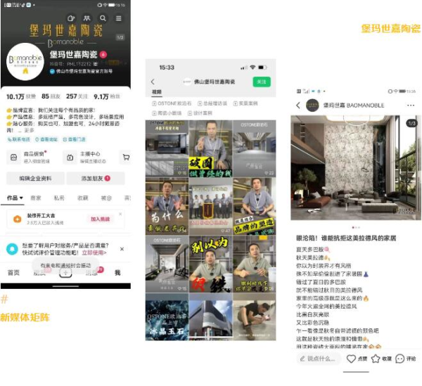 作為貼近時代的陶瓷品牌,堡瑪世嘉打破傳統(tǒng)的渠道邊界,早早布局了新媒體渠道,搶先占據流量,重點經營微信公眾號、小紅書、抖音、視頻號、快手、B站、新浪微博,實現立體化互聯網賦能,加大引流,精準鎖客。