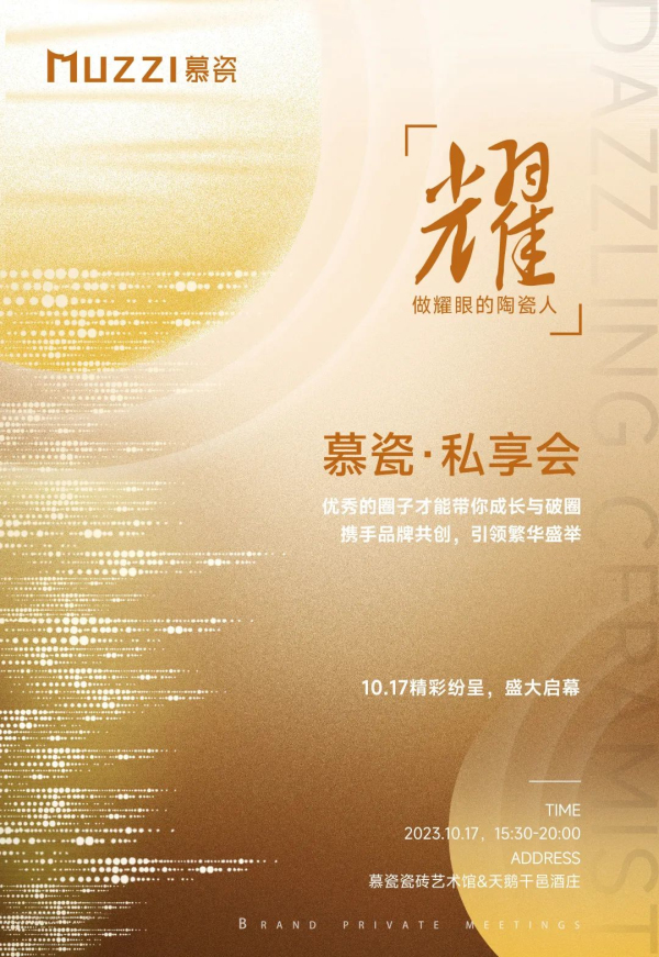 與鳳凰同飛,必是俊鳥(niǎo),與虎狼同行,必是猛獸。優(yōu)秀的圈子,不僅能財(cái)富破圈,還帶來(lái)格局、眼光、審美的提升與成長(zhǎng)!敢·慕瓷私享會(huì)將于10月17日舉行,屆時(shí)將分享慕瓷品牌和產(chǎn)品趨勢(shì)的最新資訊,以及年度力度最大的優(yōu)惠政策,誠(chéng)邀有意向加盟的經(jīng)銷商朋友到場(chǎng)參加。