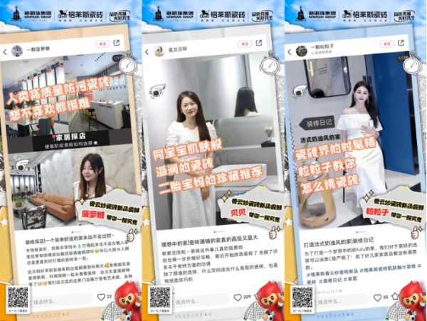 直播間外,邀請(qǐng)小紅書影響力家居達(dá)人,線下打卡阜南、武漢、清遠(yuǎn)三城門店,體驗(yàn)香云紗新品肌膚釉瓷磚像嬰兒肌膚般的柔和順滑觸感,以及優(yōu)秀的防污能力,感受非遺文化在質(zhì)感瓷磚的傳承,除了香云紗瓷磚以外更多的瓷磚搭配選項(xiàng),樣板間展示對(duì)裝修靈感的啟發(fā)。