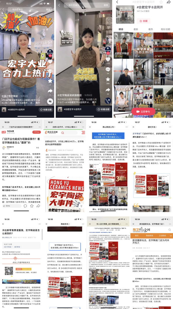 宏宇陶瓷全國(guó)門店、星主播們以短視頻方式為合肥八店同開(kāi)打Call造勢(shì),自發(fā)話題【#合肥宏宇8店同開(kāi)】?jī)H3天即突破340w+曝光量,自帶流量引爆開(kāi)業(yè)熱度,通過(guò)密集曝光,緊抓客戶眼球,搶占潛在客戶的消費(fèi)心智。