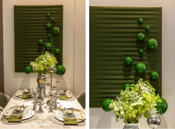 一抹清新自然的綠,無疑讓人精神為之一振。橄欖綠的軟包上嵌著立體的裝飾圓球,由遠(yuǎn)及進(jìn)漫出畫框,是自然的傾瀉,更是沖破條框的巧思。