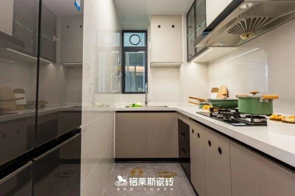 廚房以地面通鋪配合淺色的簡約墻面,素雅潔凈的賓科白無疑是最佳的選擇,淡雅的紋理輕輕躍于磚面,光潔細(xì)膩的光感,讓小廚房有視覺膨脹的效果。