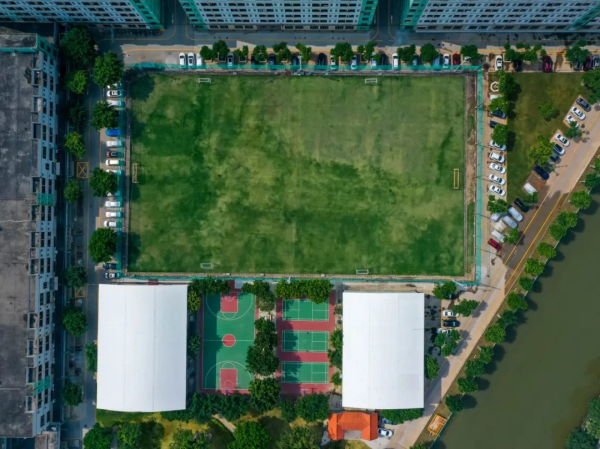 園區(qū)內(nèi)綠草茵茵的足球場和籃球場