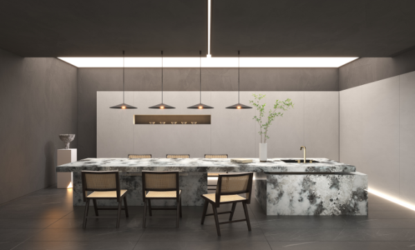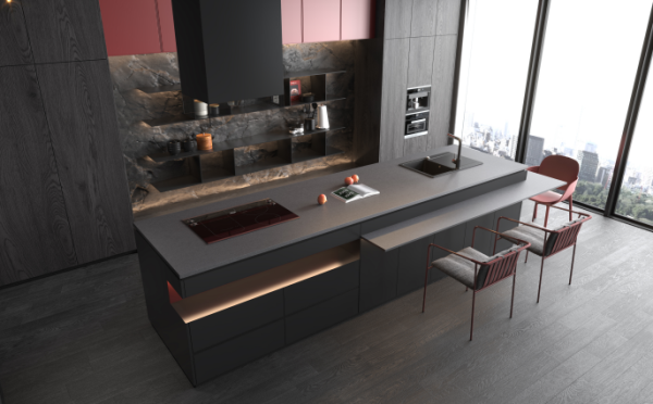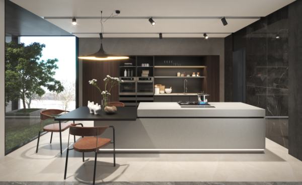 擁有一個(gè)高顏值、高品質(zhì)的廚房,會(huì)讓整個(gè)家庭變得輕松愉快。靜謐黑膚感石英門板與原木色搭配,皮粉色餐椅為裝飾元素,讓整個(gè)櫥柜看起來更具藝術(shù)感;調(diào)色應(yīng)用區(qū)分功能區(qū),將每個(gè)功能單元簡(jiǎn)化為純凈的設(shè)計(jì),并融入幾何美學(xué)概念。不僅優(yōu)雅精致,更是充分將藝術(shù)與傳統(tǒng)結(jié)合,是情感與品味的最佳代表。