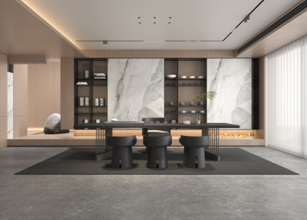 通過(guò)精工奢石和純粹的色彩創(chuàng)造出自然的效果,白色精工奢石與黑色的茶桌相互搭配,高級(jí)又時(shí)髦!茶室沒(méi)有太復(fù)雜的設(shè)計(jì),也沒(méi)有繁重的家具,讓空間更通透敞亮。
