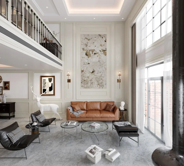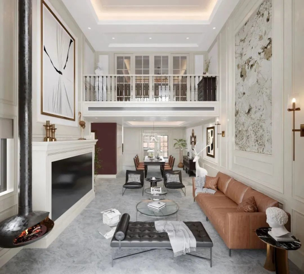 精致的外延廊橋,結(jié)合溫潤的石材光地磚、舒適的皮質(zhì)沙發(fā)、溫暖的壁爐……共同點綴著起居空間,創(chuàng)造出一個溫潤的、充滿包容性、互動性的場域。