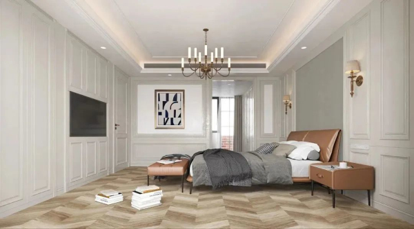 私區(qū)不同于公區(qū)的熱鬧煙火氣,臥室加入了薩米特魚骨木紋地磚等木色元素,從而營造出更為舒緩、解壓的氛圍。
