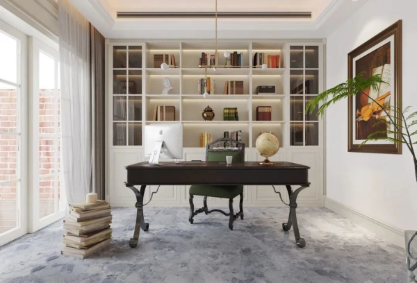 書房過道一側(cè)做了頂天立地的收納柜很好地解決了收納問題,立面柜門復(fù)古的造型,視覺上衍生了空間的經(jīng)典氣質(zhì)。