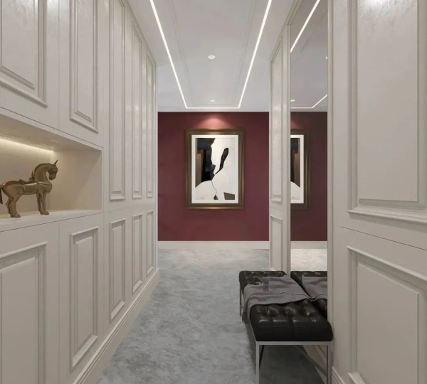 過道盡頭以薩米特皮紋系列的路鉑廷紅點亮了整個空間,恰到好處的點綴,盡顯對品質(zhì)生活的理智追求。