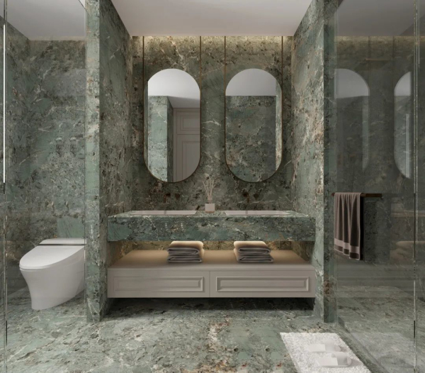衛(wèi)生間的設(shè)計簡而不凡,墻地統(tǒng)一的瑪瑙藍巖板鋪貼,凸顯了空間的連貫大氣,緩而綿延,將空間形成強烈的包裹感,呈現(xiàn)出自由流暢的空間感受。