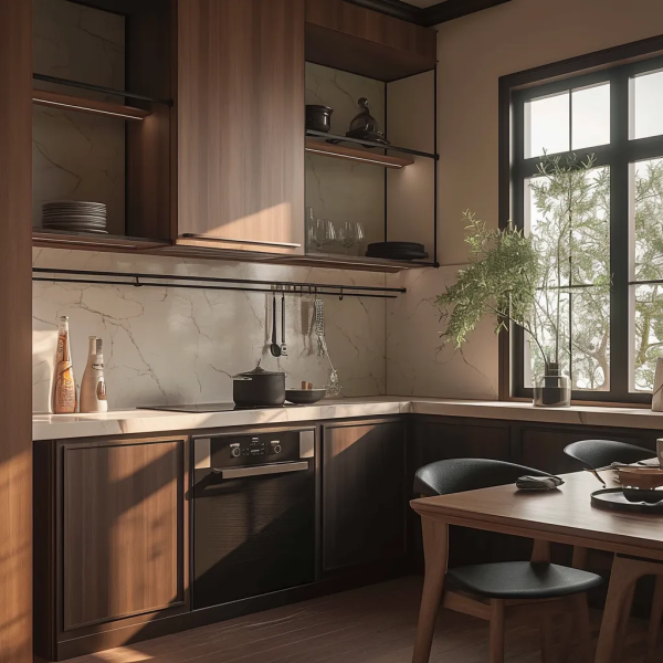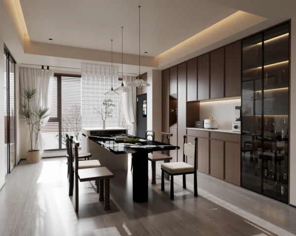 中式美學(xué)的設(shè)計理念核心在于“簡而不凡”,刪繁就簡,注重線條的簡潔和材料的質(zhì)感,力求在簡約中體現(xiàn)高雅和精致。在廚房設(shè)計中,這種風(fēng)格強(qiáng)調(diào)自然材質(zhì)的使用和簡潔線條的搭配,營造出一種清新、寧靜的環(huán)境。