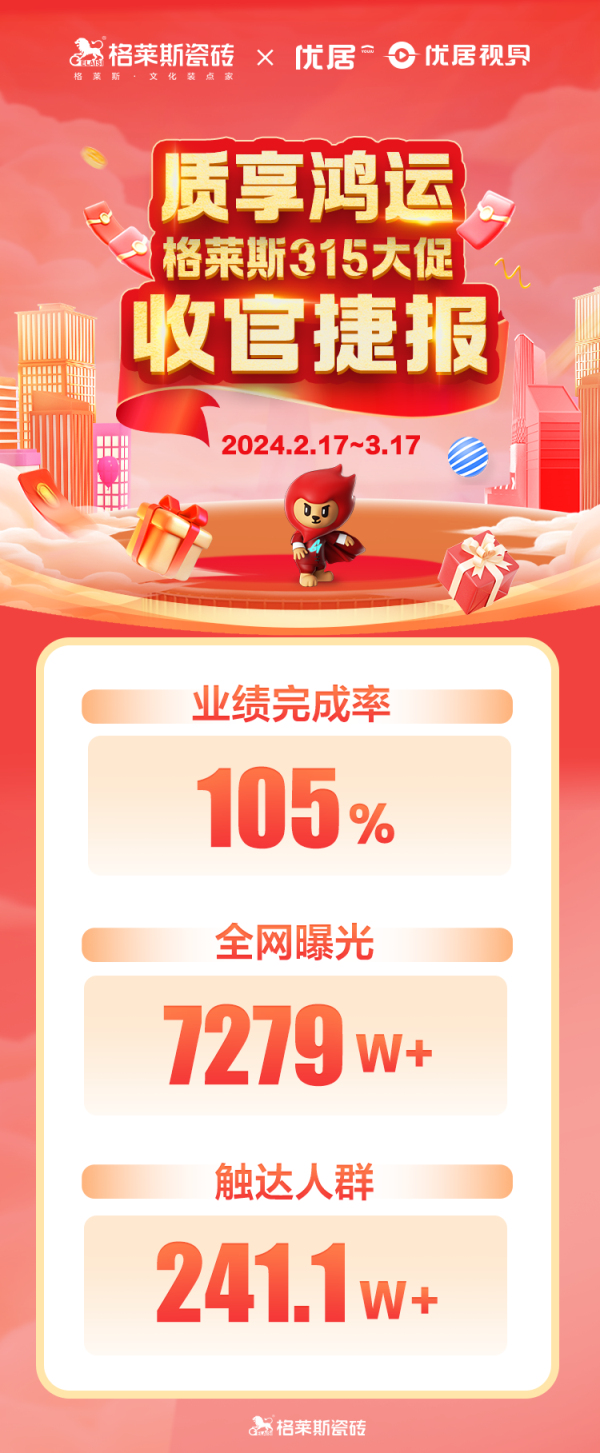回顧2024年,格萊斯發(fā)力多維度營(yíng)銷(xiāo),合理利用數(shù)字技術(shù)和工具打通線(xiàn)上和線(xiàn)下渠道,提升整體市場(chǎng)營(yíng)銷(xiāo)效果和用戶(hù)體驗(yàn),所取得的成績(jī)也是可圈可點(diǎn)。在315期間,格萊斯以“鴻運(yùn)315·質(zhì)享好物季”為主題發(fā)起全案營(yíng)銷(xiāo),聯(lián)合優(yōu)居網(wǎng)權(quán)威媒體發(fā)布《2024中國(guó)瓷磚品質(zhì)消費(fèi)趨勢(shì)洞察報(bào)告》(以下簡(jiǎn)稱(chēng)“消費(fèi)趨勢(shì)報(bào)告”),結(jié)合小紅書(shū)和抖音探店,打出多渠道、全媒體的營(yíng)銷(xiāo)組合拳,全網(wǎng)總曝光量達(dá)到7313w+。