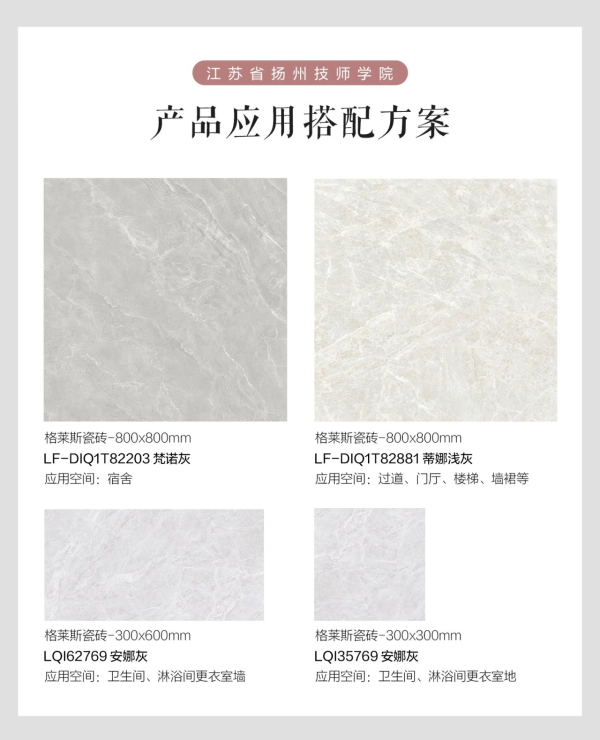 宿舍是學生在校生活期間最重要的場所之一,無論是學習、娛樂還是休息,舒適性都必不可少。學院生活區(qū)宿舍樓采用了800x800mm的梵諾灰進行鋪貼,相比于淺灰色的蒂娜淺灰,梵諾灰的明度和飽和度則更低,更適用于臥室空間。