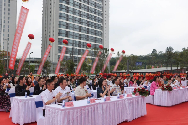 領(lǐng)導(dǎo)嘉賓代表們上臺(tái)進(jìn)行剪彩揭幕。金剪齊開(kāi),彩帶飄揚(yáng),瑞獅獻(xiàn)瑞,在全場(chǎng)熱烈的掌聲中,宜賓冠珠正式揚(yáng)帆起航!