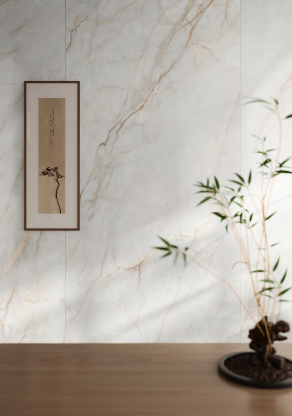 「宋境·玉」運(yùn)用45°柔拋工藝,讓磚面更加接近天然石材的光感,柔光質(zhì)感更加高級,用在客餐廳、臥室光感非常舒適;疊加了冰晶干粒,光感細(xì)節(jié)更加豐富精致。