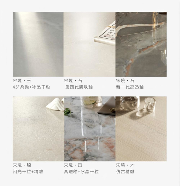 靈感溯源:系列設(shè)計(jì)題材源于宋代五大名品——玉、石、錦、畫、木,將古典風(fēng)物化為現(xiàn)代磚面紋理。