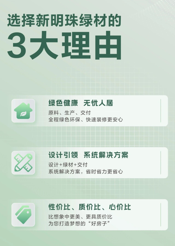 以綠材之名,踐行低碳綠色環(huán)?沙掷m(xù)的使命,新明珠綠材應(yīng)勢而生。緊跟新明珠集團(tuán)的戰(zhàn)略目標(biāo),新明珠綠材致力于成為綠色建筑空間和美好人居生活提供解決方案的服務(wù)商。依托“設(shè)計研究 + 綠建新材 + 精工交付”的新明珠“N+N”整體空間解決方案,助力人們實現(xiàn)對健康人居環(huán)境和美好生活的追求。