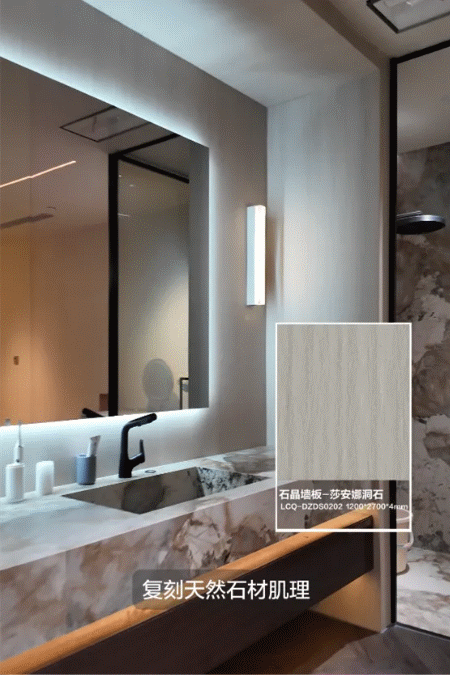 石晶墻板“莎安娜洞石”復(fù)刻天然石材的細膩紋理與質(zhì)感,防水防潮防霉、抗撞易潔的性能,在營造沉穩(wěn)大氣空間氛圍的同時,確保持久耐用。