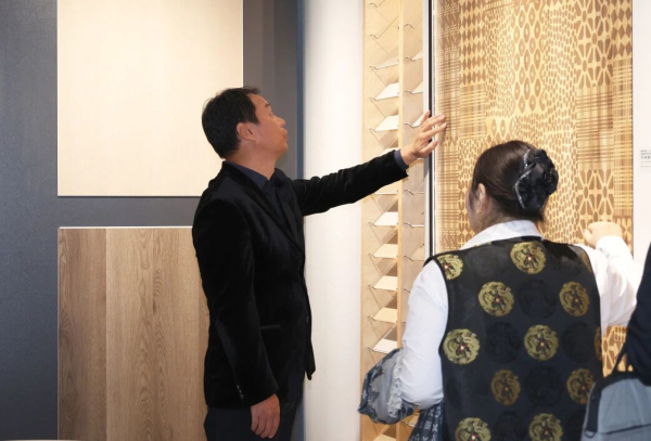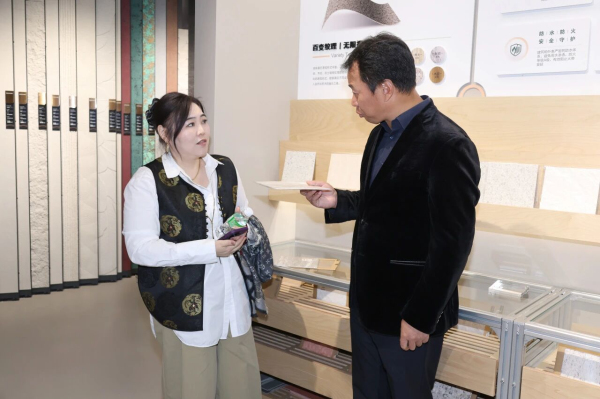 新明珠集團副總經(jīng)理、新明珠綠材執(zhí)行董事李瑩(左) 介紹產(chǎn)品