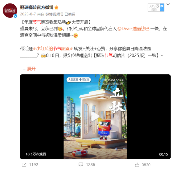 冠珠瓷磚敏銳捕捉平臺(tái)用戶特質(zhì),以“用戶需求”為導(dǎo)向的系統(tǒng)化、年輕化運(yùn)營(yíng)策略,持續(xù)輸出高品質(zhì)內(nèi)容。2025年,冠珠瓷磚借勢(shì)全球品牌代言人迪麗熱巴的國(guó)民影響力,精準(zhǔn)對(duì)話年輕群體,實(shí)現(xiàn)品牌熱度攀升,截止到2025年12月,“冠珠瓷磚官方微博”累計(jì)粉絲量達(dá)到185.7萬(wàn),#冠珠瓷磚全球品牌代言人迪麗熱巴#、#與迪麗熱巴一塊煥新家#等品牌話題閱讀量累計(jì)突破24.9億,實(shí)現(xiàn)品牌與年輕世代的深度共振。