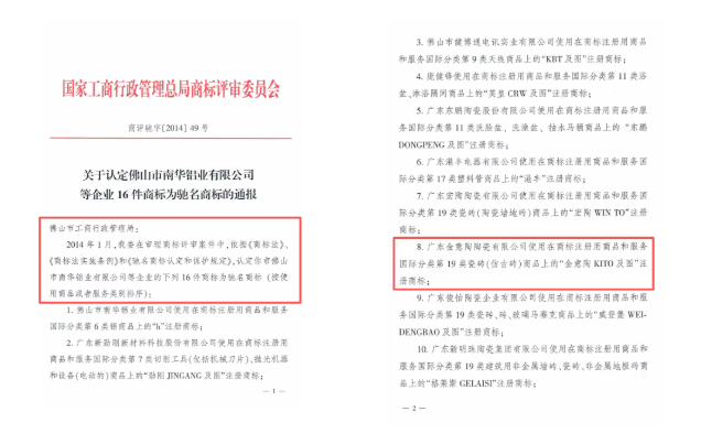 廣東金意陶陶瓷集團(tuán)有限公司自2004年開始,創(chuàng)立了國(guó)際化的高端品牌“金意陶(KITO)”,是第3254530號(hào)、第3550212號(hào)注冊(cè)商標(biāo)的權(quán)利人,而且第3254530號(hào)商標(biāo)在2014年更是被評(píng)為瓷磚商品上的馳名商標(biāo)。