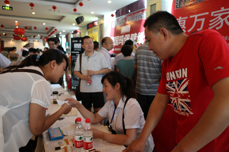 630下午,由滕州日?qǐng)?bào)主辦的建材、家居、家電團(tuán)購(gòu)會(huì)在滕州賓館舉行;萑f(wàn)家陶瓷、TATA木門(mén)、索菲亞衣柜等12大知名品牌瘋狂讓利,巨大的優(yōu)惠吸引了近千名消費(fèi)者前來(lái)選購(gòu)。經(jīng)過(guò)近四小時(shí)的砍價(jià)、下單、抽獎(jiǎng)、明星簽名等環(huán)節(jié),惠萬(wàn)家陶瓷現(xiàn)場(chǎng)成功簽下60余個(gè)訂單。