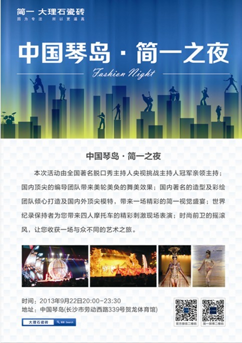 9月22日,簡一大理石瓷磚聯(lián)合琴島在長沙打造一場以《中國琴島•簡一之夜》的大型視覺盛宴。這是一場匯聚全國各地室內設計師的聚會,這是一場建陶行業(yè)推廣活動的革命,這是一場行業(yè)史無前例的視覺盛宴。