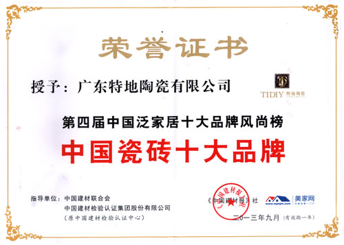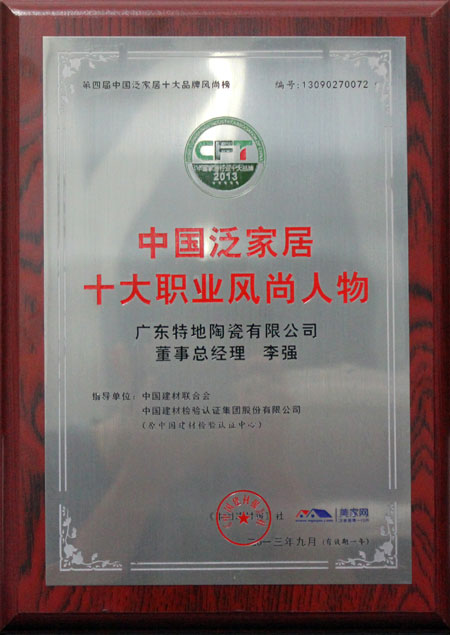 2013年9月28日,由中國(guó)建材聯(lián)合會(huì)指導(dǎo),中國(guó)建材檢驗(yàn)認(rèn)證中心、中國(guó)建材報(bào)社主辦,美家網(wǎng)、廣州長(zhǎng)漢商務(wù)有限公司聯(lián)合承辦的中國(guó)綠色建材質(zhì)量年啟動(dòng)儀式暨第四屆中國(guó)泛家居十大品牌風(fēng)尚榜頒獎(jiǎng)大會(huì),在廣東佛山南國(guó)桃園楓丹白露酒店盛大舉行。工會(huì)領(lǐng)導(dǎo)以及眾企業(yè)代表等300多位嘉賓群賢匯聚,共證此次盛會(huì),特地陶瓷作為此次盛會(huì)的品牌代表受邀參加活動(dòng),榮獲“中國(guó)瓷磚十大品牌”的榮譽(yù)稱號(hào),同時(shí)特地陶瓷董事總經(jīng)理李強(qiáng)個(gè)人也獲得“中國(guó)泛家居十大職業(yè)風(fēng)尚人物”稱號(hào)。