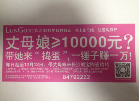 旅客王先生說:“讓丈母娘抵消費,這招太損了,只怕會激發(fā)丈母娘和女婿之間的矛盾。”旅客劉女士說:“這個廣告很有創(chuàng)意,如果我女婿在長沙,一定跟他去碰碰運氣,能幫他賺多少就賺多少!”記者也專門咨詢了著名營銷策劃人陳海生:“朗寶致力于打造婚房陶瓷第一品牌,這個廣告就是迎接‘雙12’做的活動,我們覺得沒有什么不妥,它準確傳遞了我們想要傳遞的信息:從 即日至12月12日全場5折;折后滿10000元減1212元;雙12當天,帶丈母娘砸金蛋再送12平方瓷磚(最高享萬元優(yōu)惠),還有機會贏翡翠(價值2000元)!加長沙朗寶陶瓷微信(cslbtc)送德芙巧克力!就是實實在的給長沙有愛的家庭送幸福。”