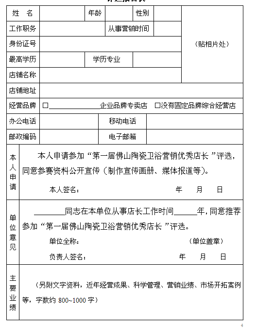 附件1:“第一屆佛山陶瓷衛(wèi)浴營(yíng)銷優(yōu)秀店長(zhǎng)”評(píng)選報(bào)名表