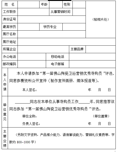 附件2:“第一屆佛山陶瓷衛(wèi)浴營(yíng)銷優(yōu)秀導(dǎo)購(gòu)員”評(píng)選報(bào)名表
