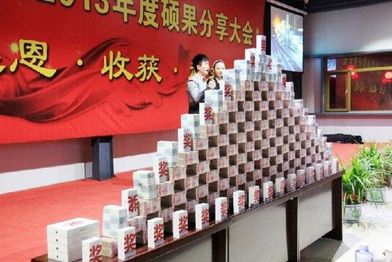 2014年01月21日,河南柘城,某地產(chǎn)全體員工召開“2013年度碩果分享大會”。現(xiàn)場發(fā)放工資、獎金總額共達1100萬元,有的員工最多發(fā)200萬元,直接用麻袋裝現(xiàn)金。抽獎獎品包括30部iPhone5s、5臺42寸液晶電視、2部手提電腦、3臺空調及Ipad mini、電動車、電冰箱、相機等大獎。堆積如山的1100萬現(xiàn)金。