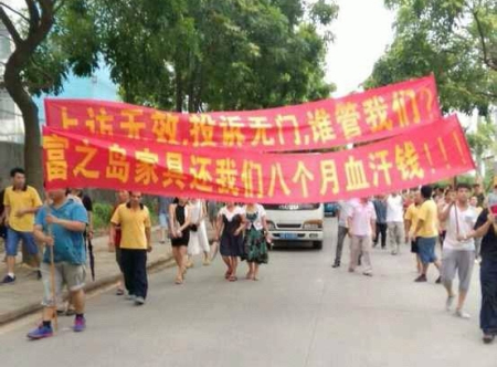 在網(wǎng)友爆料的照片中可以看到,大批工人手舉“富之島家具還我們八個(gè)月血汗錢(qián)”等標(biāo)語(yǔ)聚集在富之島工廠門(mén)前。另有照片顯示,龍崗街道勞動(dòng)管理辦在大富豪的辦公樓玻璃門(mén)上貼出通告:“目前你單位約180名辦公室員工2013年6-7月份,2013年12月至2014年5月份工資和約320名車(chē)間員工2014年3-5月份工資未發(fā)放,總金額約1000萬(wàn)元人民幣,造成員工情緒不穩(wěn),F(xiàn)告知你企業(yè)負(fù)責(zé)人何純正于2014年6月23日下午6:00前與龍崗街道勞動(dòng)管理辦李先生聯(lián)系,處理員工工資事宜,逾期我辦將采取相應(yīng)的法律措施解決員工工資問(wèn)題,并依法追究你單位拖欠員工工資的法律責(zé)任。”