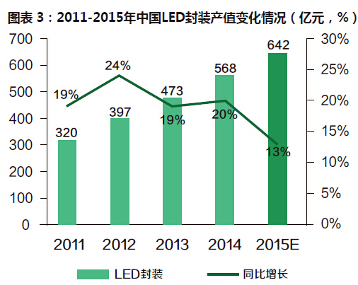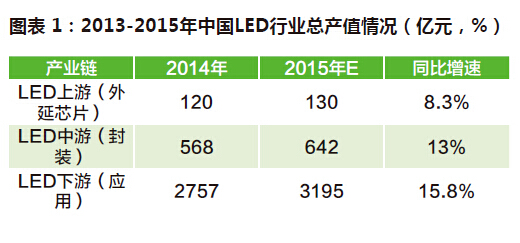 統(tǒng)計(jì)數(shù)據(jù)顯示,2015年中國LED行業(yè)總產(chǎn)值預(yù)計(jì)可達(dá)3967億元,同比增長15.1%。其中,LED上游外延芯片、中游封裝、下游應(yīng)用產(chǎn)值分別為130億元、642億元、3195億元,同比分別增長8.3%、13%和15.8%。