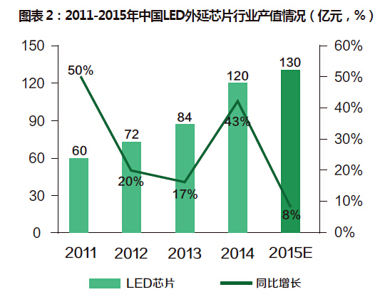 GGII統(tǒng)計(jì)數(shù)據(jù)顯示,2015年中國LED芯片行業(yè)規(guī)模預(yù)計(jì)可達(dá)130億元,相較于2014年增長8.3%。2015年,三安、華燦等芯片大廠持續(xù)擴(kuò)產(chǎn),加之下游需求放緩明顯,行業(yè)競爭加劇,芯片價(jià)格下滑幅度較大,全年LED芯片產(chǎn)量增長達(dá)60%,但產(chǎn)值僅增8.3%。