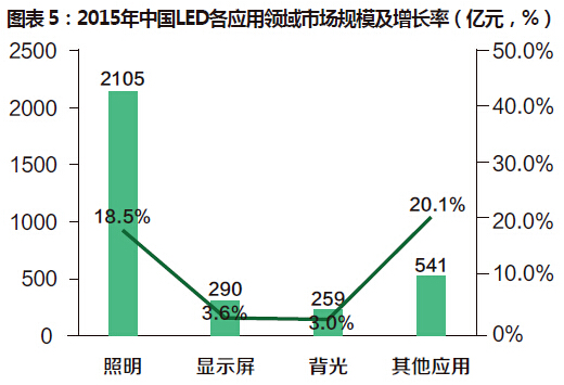 2015年,中國LED應(yīng)用市場規(guī)模預(yù)計(jì)可達(dá)3195億元,同比增長15.8%,應(yīng)用增速大幅下滑。LED照明是LED應(yīng)用領(lǐng)域發(fā)展的主要引擎,GGII統(tǒng)計(jì)數(shù)據(jù)顯示,2015年中國LED照明產(chǎn)值規(guī)模達(dá)2105億元,同比增長18.5%。從中國LED各應(yīng)用領(lǐng)域市場規(guī)模來看,顯示屏和背光已處于微增長狀態(tài),照明和其他應(yīng)用仍呈較快增長態(tài)勢,然而相比2014年增速卻大幅下滑。