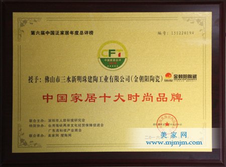 喜報(bào)!金朝陽(yáng)陶瓷喜獲“中國(guó)家居十大時(shí)尚品牌”榮譽(yù)稱(chēng)號(hào)