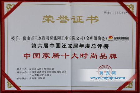 2016年1月7日下午,由國(guó)際建筑裝飾室內(nèi)設(shè)計(jì)協(xié)會(huì)主辦的第四屆中國(guó)泛家居領(lǐng)袖品牌論壇暨第六屆中國(guó)泛家居十大品牌總評(píng)榜頒獎(jiǎng)大會(huì),盛大舉行。新明珠集團(tuán)旗下強(qiáng)勢(shì)品牌金朝陽(yáng)陶瓷榮獲“中國(guó)家居十大時(shí)尚品牌”殊榮。
