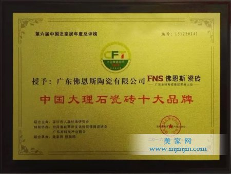 評(píng)委會(huì)通過獲利能力指標(biāo)、成長(zhǎng)指標(biāo)、創(chuàng)新力指標(biāo)等綜合指標(biāo)進(jìn)行評(píng)估,最終,佛恩斯瓷磚憑優(yōu)秀的產(chǎn)品研發(fā)設(shè)計(jì)及生產(chǎn)技術(shù),喜獲中國大理石瓷磚十大品牌!