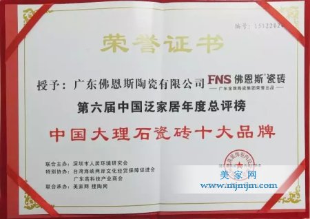 喜訊丨佛恩斯瓷磚喜獲中國大理石瓷磚十大品牌