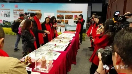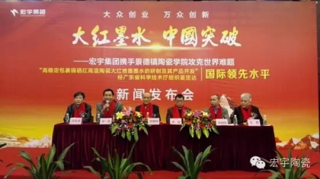 新聞發(fā)布會(huì)現(xiàn)場(chǎng),中國建筑衛(wèi)生陶瓷協(xié)會(huì)副秘書長尹虹教授、廣東省建筑材料行業(yè)協(xié)會(huì)吳一岳會(huì)長、宏宇集團(tuán)副總經(jīng)理歐家瑞以及大紅墨水研發(fā)領(lǐng)頭人宏宇集團(tuán)瓷片廠廠長余國明、景德鎮(zhèn)陶瓷學(xué)院材料學(xué)院副院長汪永清教授端坐主席臺(tái),對(duì)臺(tái)下各大媒體記者提出的問題一一作答。
