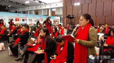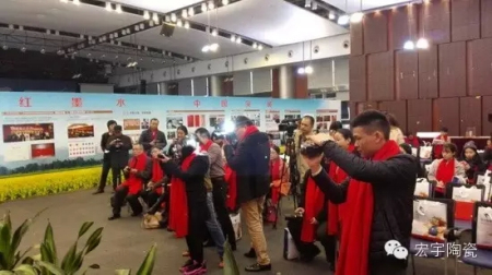 新聞發(fā)布會(huì)現(xiàn)場(chǎng)嘉賓每人佩戴一條大紅圍巾,整個(gè)會(huì)場(chǎng)一片紅紅火火、欣欣向榮!大紅墨水,中國突破!宏宇集團(tuán)助力中國陶瓷行業(yè)2016開年紅!