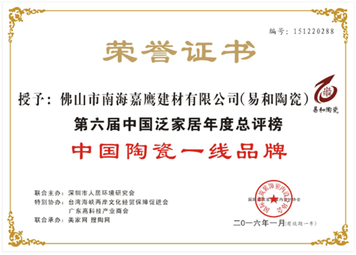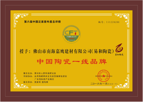 2016年1月7日下午,由國(guó)際建筑裝飾室內(nèi)設(shè)計(jì)協(xié)會(huì)、中國(guó)國(guó)際環(huán)境藝術(shù)行業(yè)協(xié)會(huì)綠色節(jié)能家居建材委員會(huì)、臺(tái)灣海峽兩岸文化經(jīng)貿(mào)保障促進(jìn)會(huì)、深圳市人居環(huán)境研究會(huì)攜手美家網(wǎng)、搜陶網(wǎng)共同舉辦“第四屆中國(guó)泛家居領(lǐng)袖品牌論壇暨第六屆中國(guó)泛家居十大品牌總評(píng)榜”在廣東佛山金盈·綠島國(guó)際中心舉辦。易和陶瓷在眾多品牌中脫穎而出,獲得了“中國(guó)陶瓷一線品牌”的稱號(hào)。
