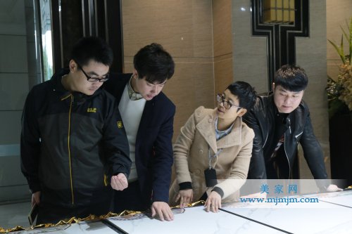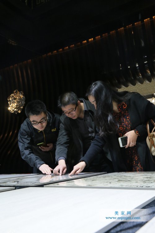 在精工玉石選材區(qū),堂皇亮麗的選材區(qū)吸引設(shè)計師們眼球,設(shè)計師細(xì)細(xì)觀看紋理精雕細(xì)琢、畫質(zhì)高清、花色高貴迷人的精工玉石,聽著姚經(jīng)理對產(chǎn)品鑒賞以及高深工藝之闡述,無不發(fā)出“僅此一家”的感嘆!設(shè)計部陳總則跟大家介紹配套中的重頭戲——精工玉石金屬背景墻,設(shè)計師均對多款造型精美的背景墻表現(xiàn)出濃厚的興趣,向陳總詢問產(chǎn)品的材質(zhì)與應(yīng)用,對產(chǎn)品仔細(xì)鑒賞。
