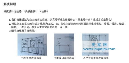 發(fā)現(xiàn)問題,就要解決問題。在這個案子的過程中,得出一個設計工作輪——兵棋推演。首先,了解業(yè)主需求。其次,參觀業(yè)主現(xiàn)居房子,了解生活習慣,繼而空間模擬,最后以手繪的表現(xiàn)形式,讓業(yè)主更立體明白我們所要表達的意思。