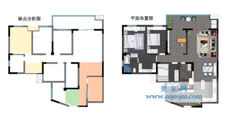 設計難點:原始結構戶型不合理。其一,采光通風達不到要求;其二,現(xiàn)有的生活空間功能性不能滿足業(yè)主的生活需求,如餐廳、客廳并不能滿足家庭聚會的;其三,業(yè)主在臥室生活空間對儲物功能的不滿足。