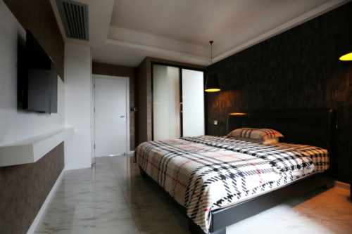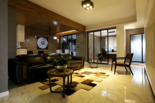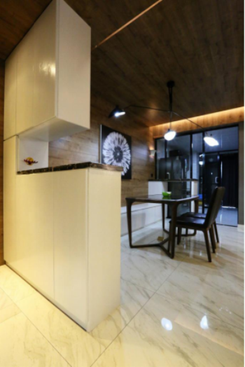 《融合》 整體格局上將居室內(nèi)除臥室外的單個空間盡量打開,和公共空間融合互動。由人在空間中不同時間的不同機(jī)能需求來控制單個空間的開放和閉合,這種彈性空間的設(shè)置為人們提供了更多互動交流的機(jī)會,也為一個家庭提供了團(tuán)團(tuán)圓圓其樂融融的和諧空間。滿足空間的通透性的同時注重空間中的體塊穿插和構(gòu)成,餐廳的木質(zhì)墻頂面,和富有張力的電視主墻,同時功能上將客餐廳的收納物品隱藏在壁柜和地柜中,使空間更加和諧統(tǒng)一。