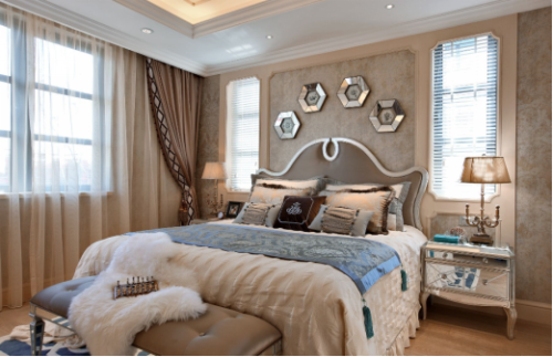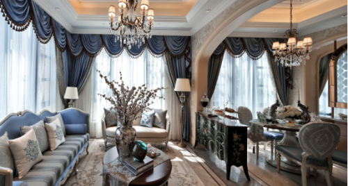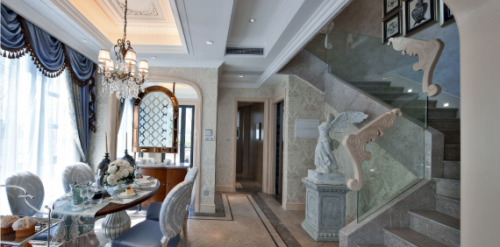 本案采用藍(lán)色色彩設(shè)計手法,打造出空間適度的奢華氣質(zhì)。設(shè)計師以通過文化氣息加入歷史性的石材雕像體現(xiàn)了大氣浪漫的感覺。是這所房子的亮點之一,就是樓梯所設(shè)計的文化氣息,簡單的代入了中國文化青花瓷點綴。